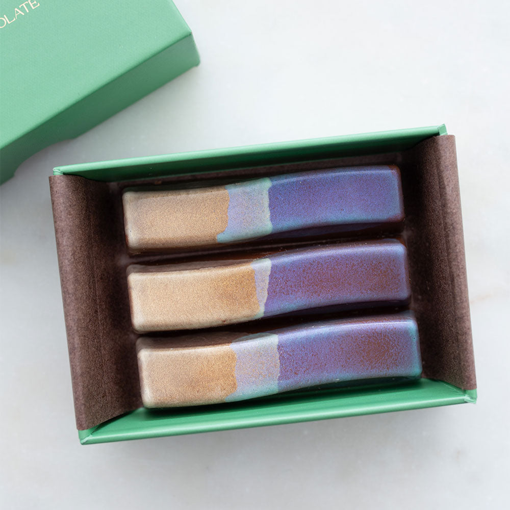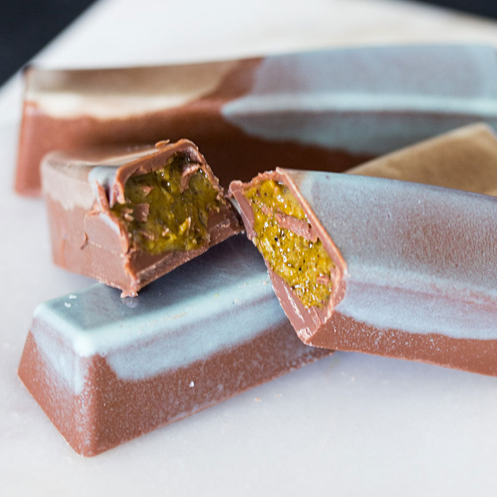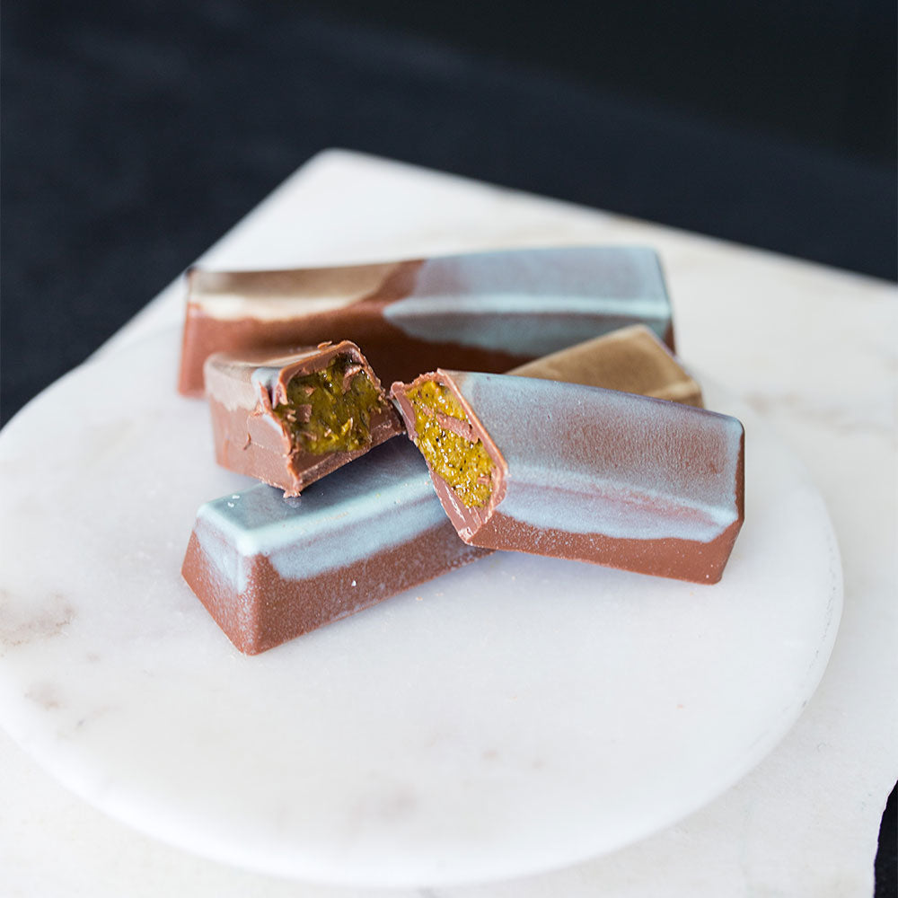 Experience the global sensation with our Viral Dubai Pistachio Knafeh Chocolate Bars. Enjoy three indulgent milk chocolate snacking bars infused with crunchy, caramelized pistachio praline and kaitaifi pastry. Also available as six individual chocolate Bonbons.