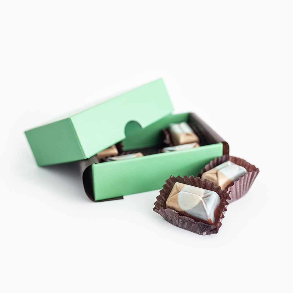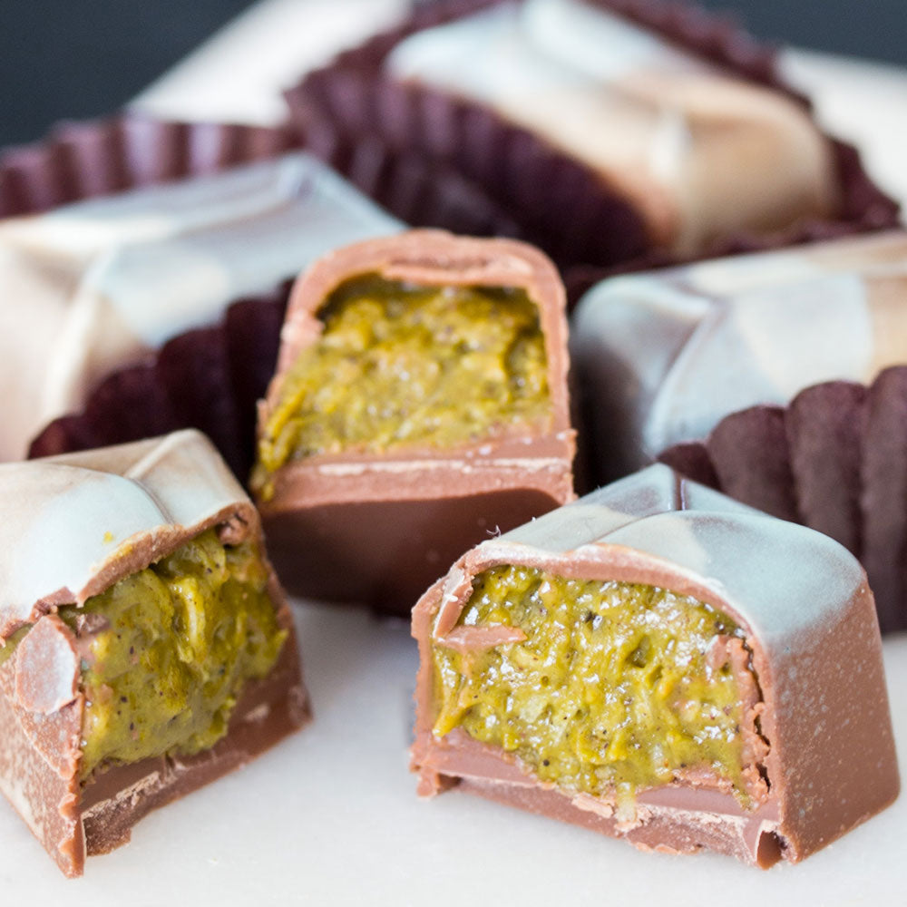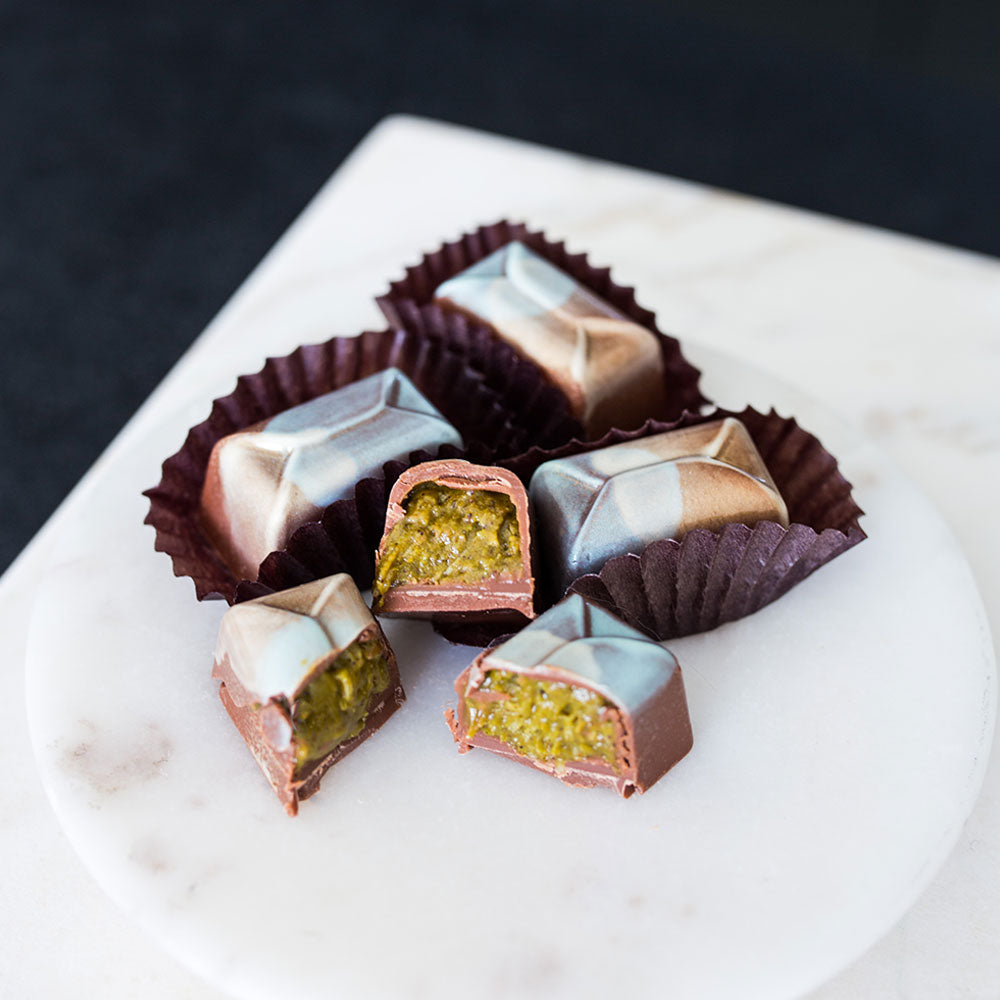 Experience the global sensation with our freshly made Viral Dubai Pistachio Knafeh Chocolate Bars. Enjoy six individual chocolate bonbons infused with crunchy, caramelized pistachio praline and kaitaifi pastry. Also available as 3 individual mini bars.