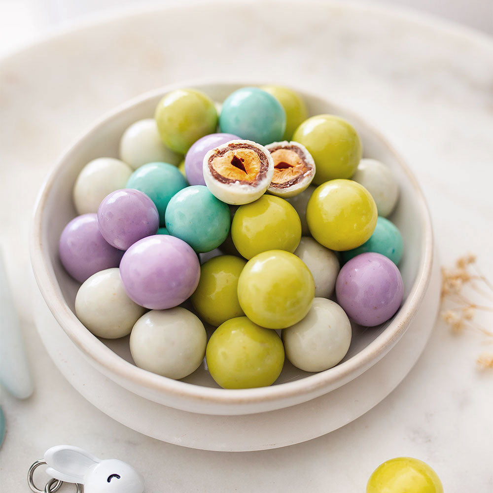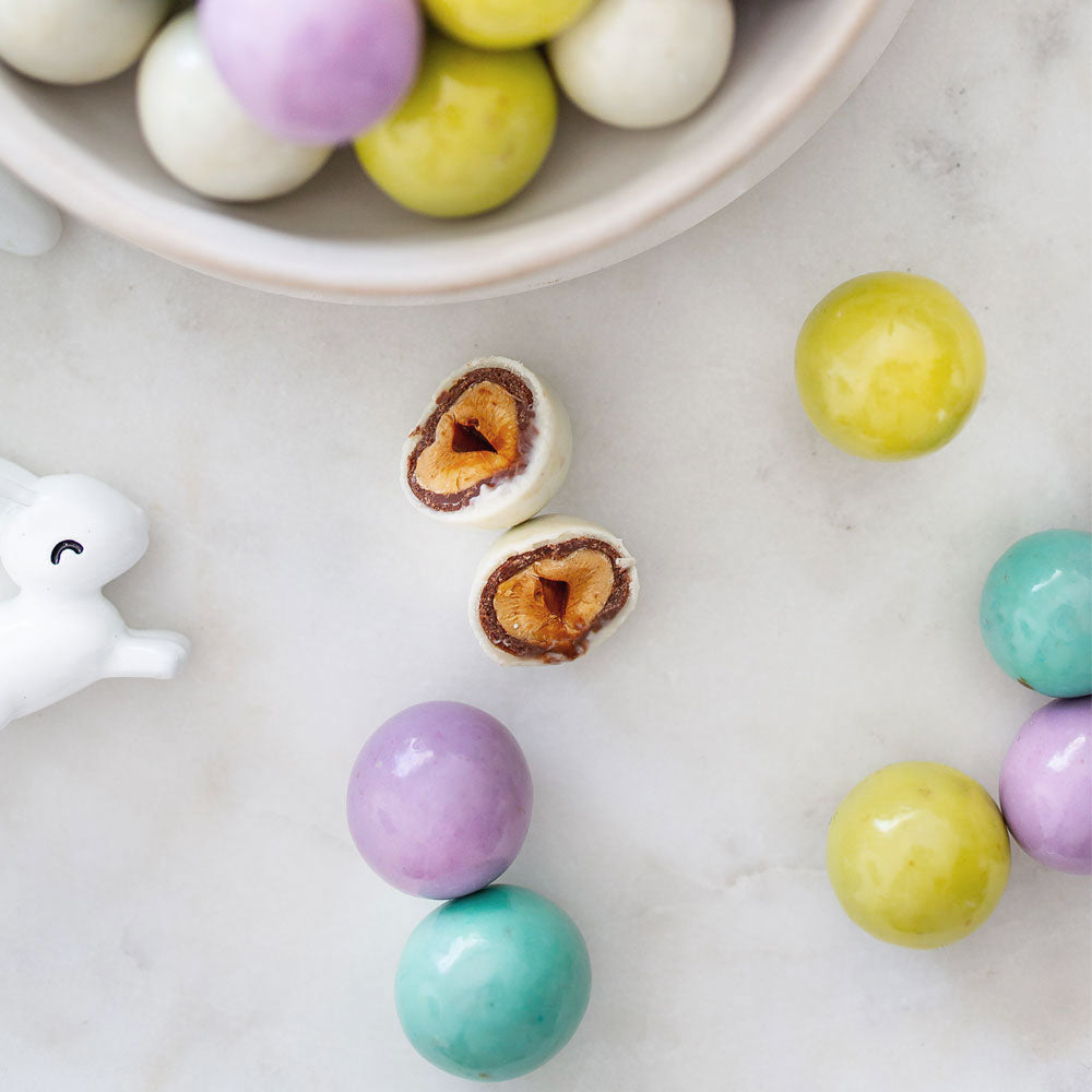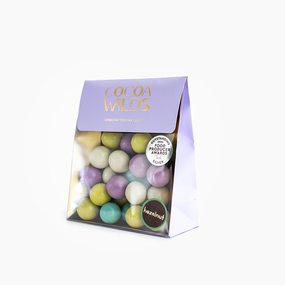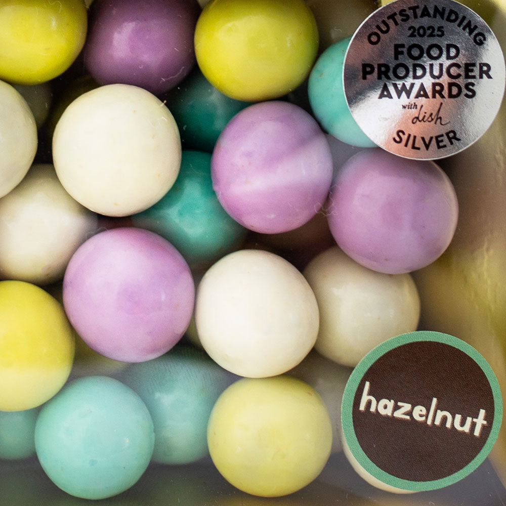 A special release. We start off with dark roasted, caramelised New Zealand grown Hazelnuts (from Nelson!). They're slowly coated in our delicious milk chocolate and finished off with pink, blue & yellow and white milk chocolate. (new image to come!)