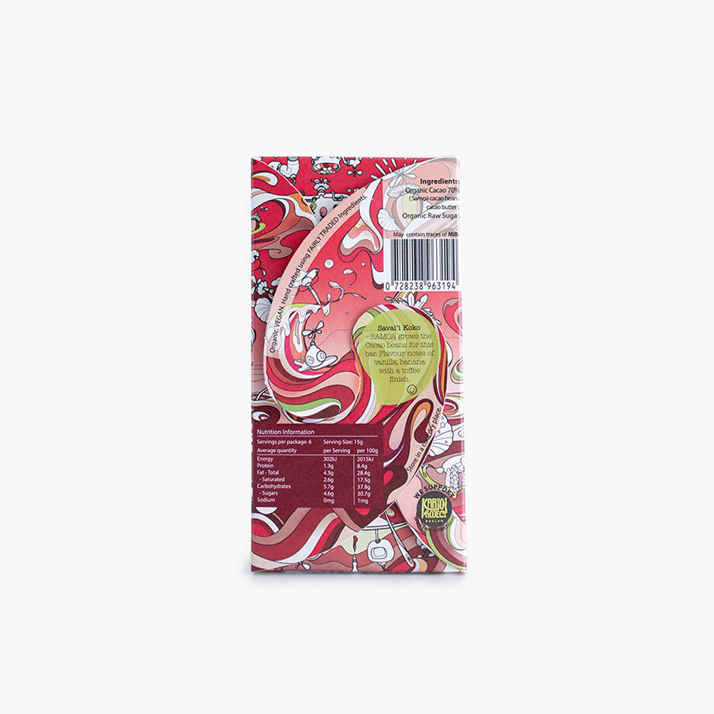 Experience the exquisite taste of single origin Samoan, Savai'i Koko 70% Dark Chocolate. This vegan bean-to-bar creation is crafted from cacao meticulously grown on the 80-hectare Savai'i Koko farm in Asau, Savai'i, Samoa. Developed over four generations by grower Tuipai Saleimoa Va'ai and his team, the farm also partners with nearly 400 local families, ensuring exceptional quality from harvest to export.