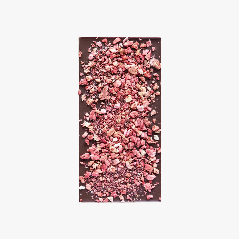 This creamy milk chocolate delivers lively notes of red stone fruit from the Tanzanian cacao, complemented by Fresh As New Zealand strawberries. The strawberries are stone-ground with the cacao in the early stages of the chocolate making process, and are also sprinkled on the back of the bar, giving a fresh fruity zing.
