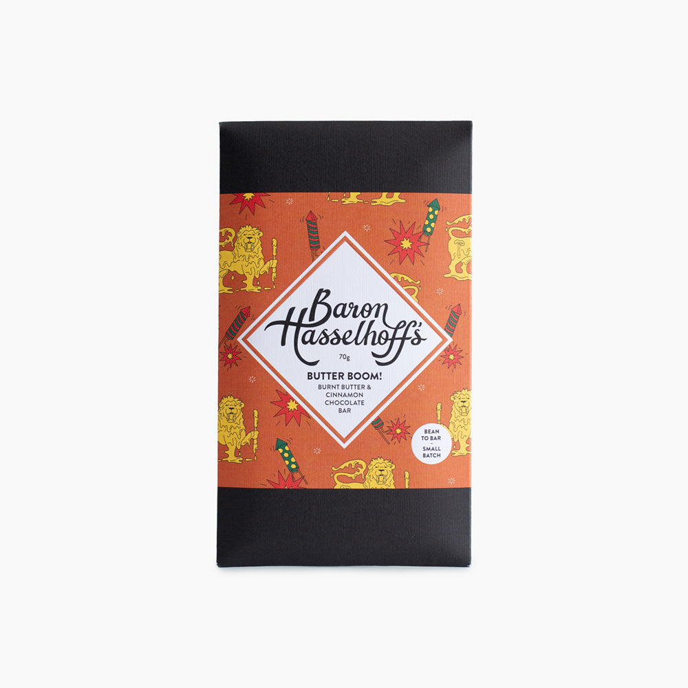 Sri Lanka’s competitive butter sculpting scene is hot, hot, hot. In fact, The Baron was in the line of fire when this year’s closing ceremony got too hot. He and his fellow competitors fled the stage after a butter-fingered pyrotechnician dropped the box of Ceylon’s Signature Cinnamon Fireworks, sparking a fragrant fire that melted their sculptures into buttery pools. Captivated by aromas of burnt butter and cinnamon in the air, The Baron decided to immortalise the night in chocolate.