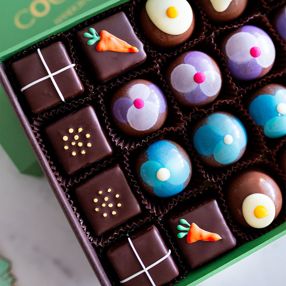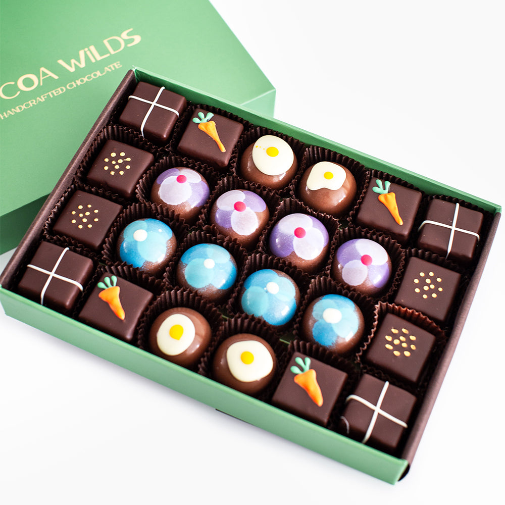 At Easter time we focus on a playful concept, where we imagine you sharing with family, younger ones and maybe scattering a few of these chocolates to be discovered with joy. These boxes were incredibly popular last year and we're so happy to make them for you again as you celebrate Easter and share something of true quality.