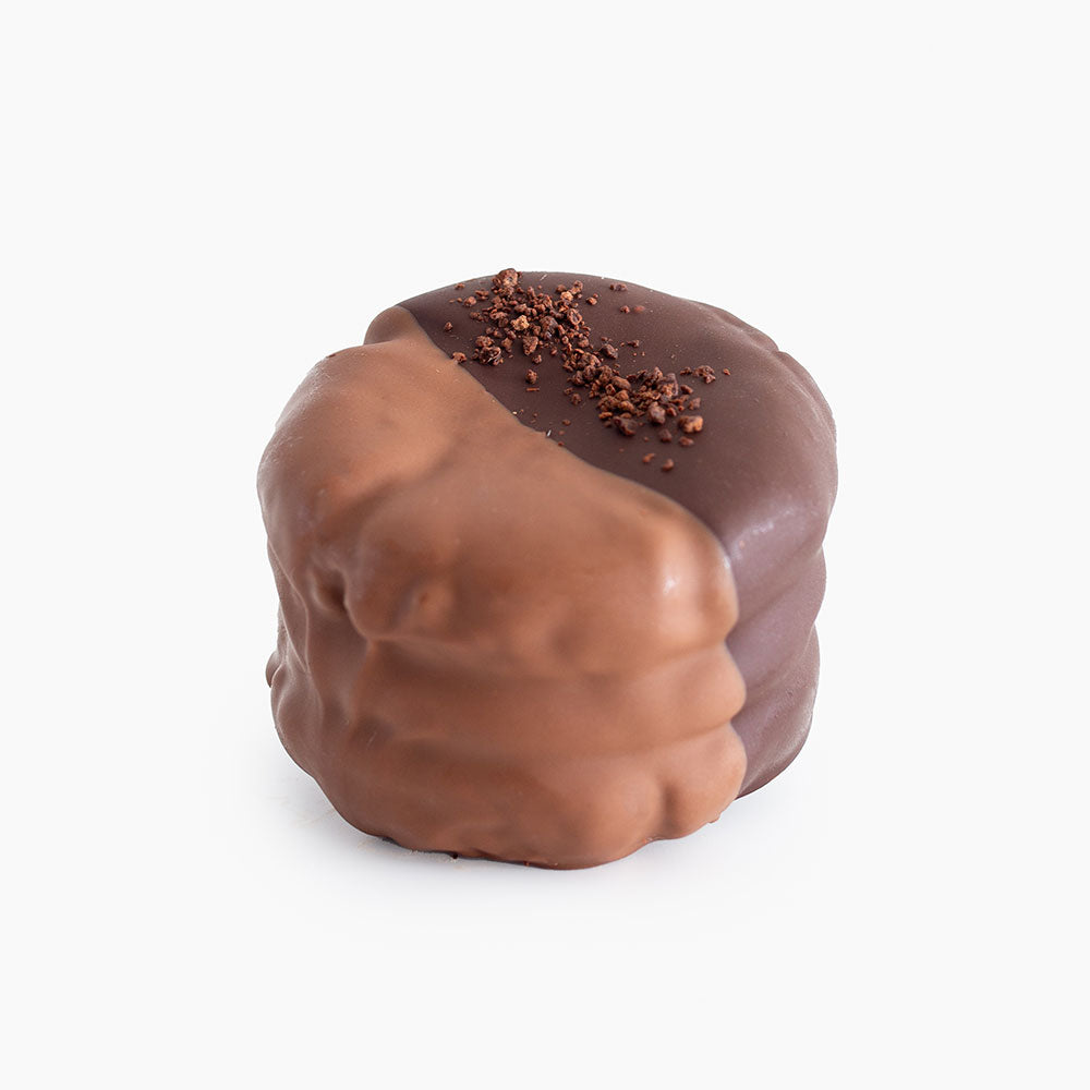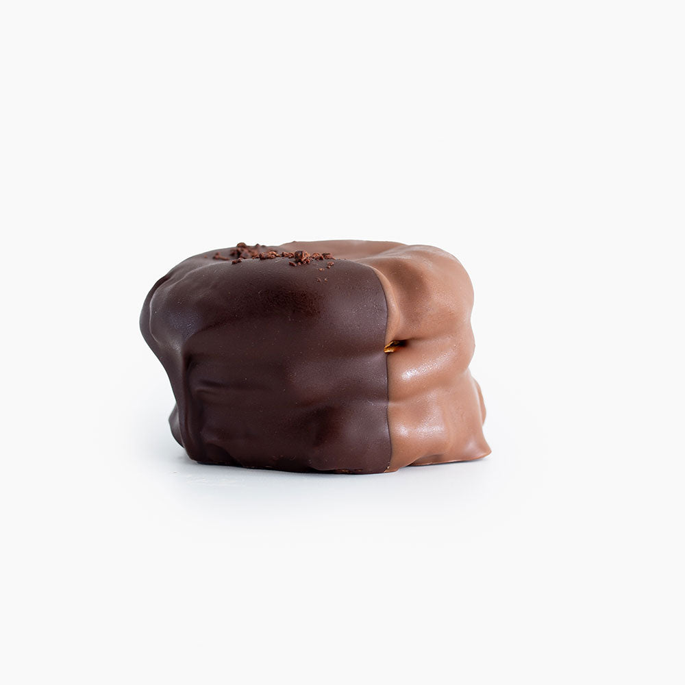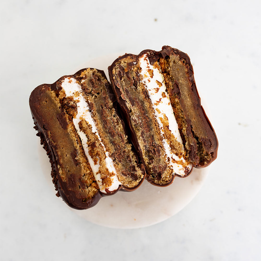 The Flookie, aka. Fluff Cookie. Made with two of our signature cookies, filled with premium dark chocolate chips, special ingredients and sea salt, sandwiching a thick layer of our toasted marshmallow fluff meringue before being coated in dark and milk chocolate.