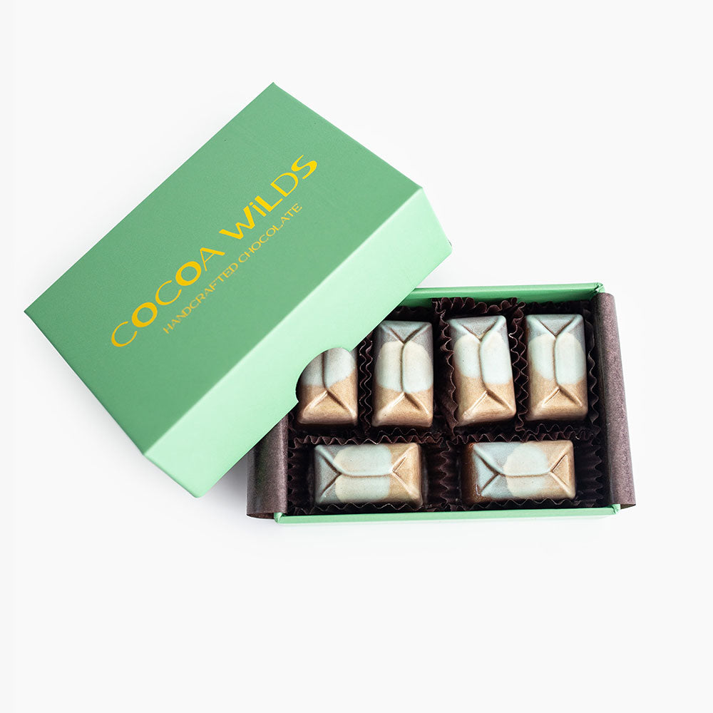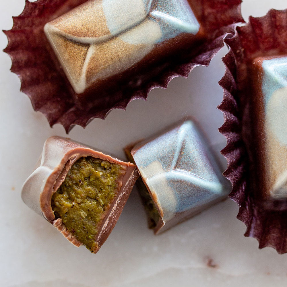 Experience the global sensation with our freshly made Viral Dubai Pistachio Knafeh Chocolate Bars. Enjoy six individual chocolate bonbons infused with crunchy, caramelized pistachio praline and kaitaifi pastry. Also available as 3 individual mini bars.